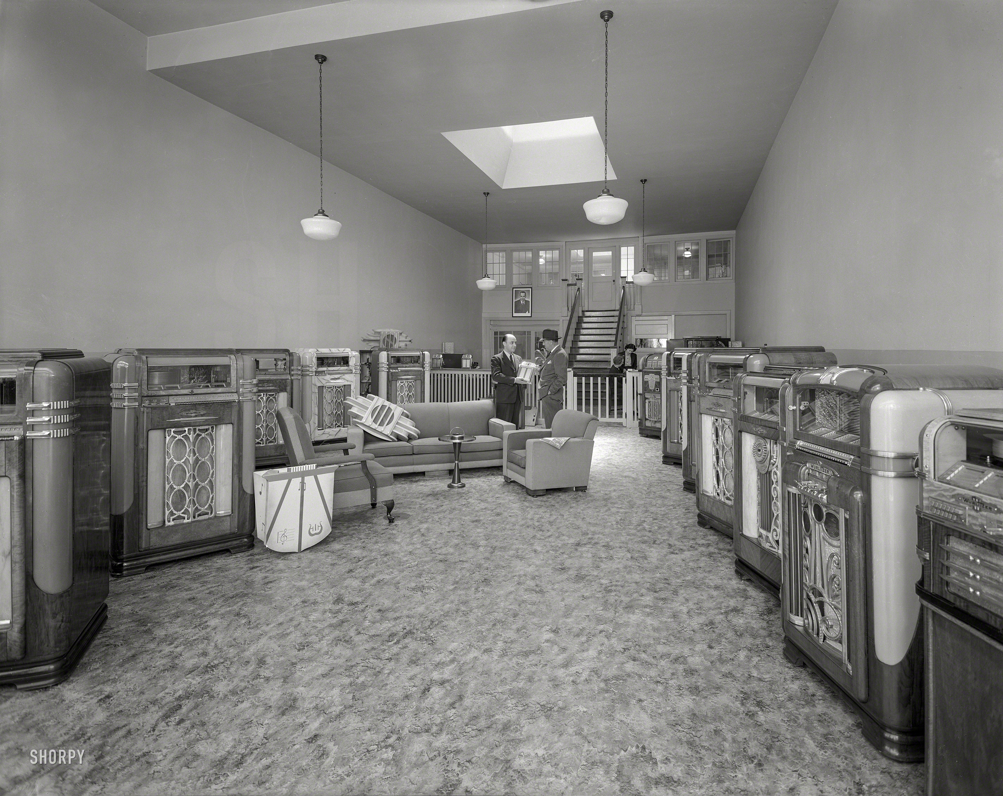 From Shorpy.com -- "San Francisco, 1939. "William Corcoran showroom, Post Street." Distributor of Wurlitzer Simplex jukeboxes as well as the Buckley Music System "Music Box," the mobile version being presented here for appraisal. 8x10 acetate negative, late of the Wyland Stanley and Marilyn Blaisdell collection" -- http://www.shorpy.com/files/images/SHORPY-1043.jpg (click image to enlarge).