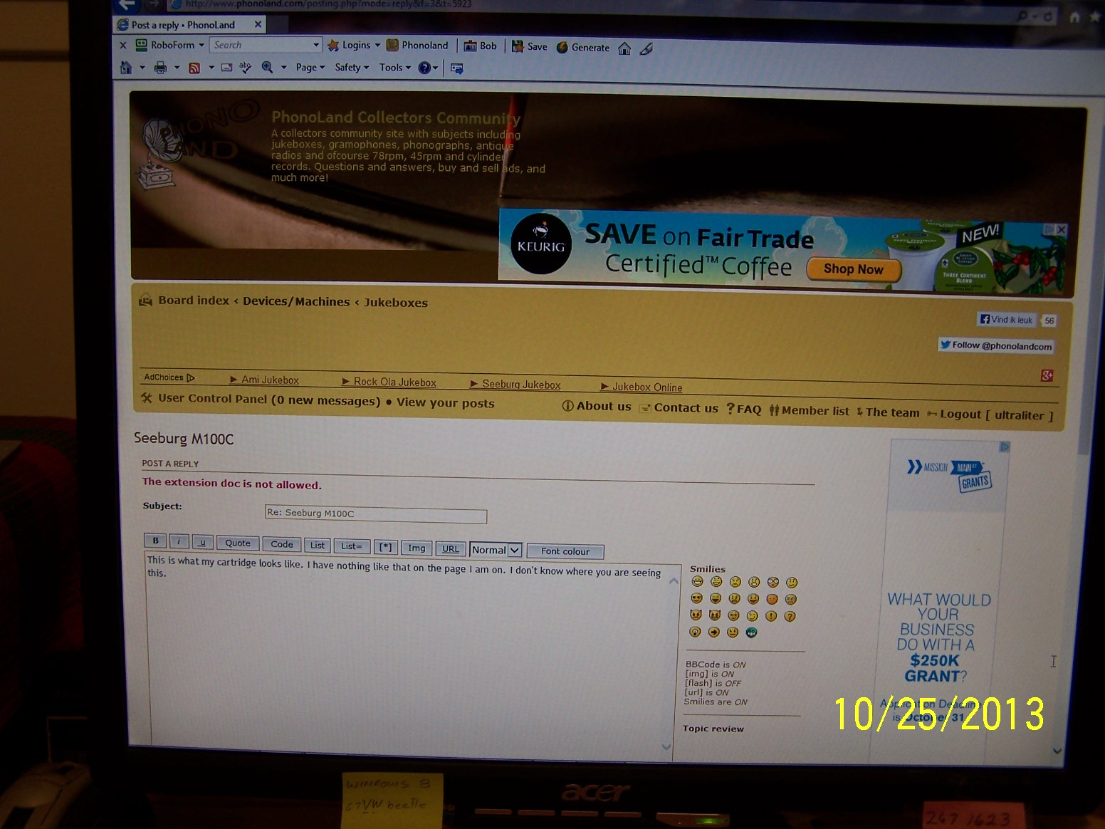 Before I bought it, the owners fired it up and it selected and played a 45, speed good at start, slowed, then back up to speed. Figure that is probably a combination of dried lubrication and, possibly, the motor start capacitor. Did not hear any hum or crackling when it was run. Has a new (according to owners) Seeburg red cartridge in it (also has an envelope with the old one, plus another that has one of the two connection pins broken off--any way or point to fixing it?)