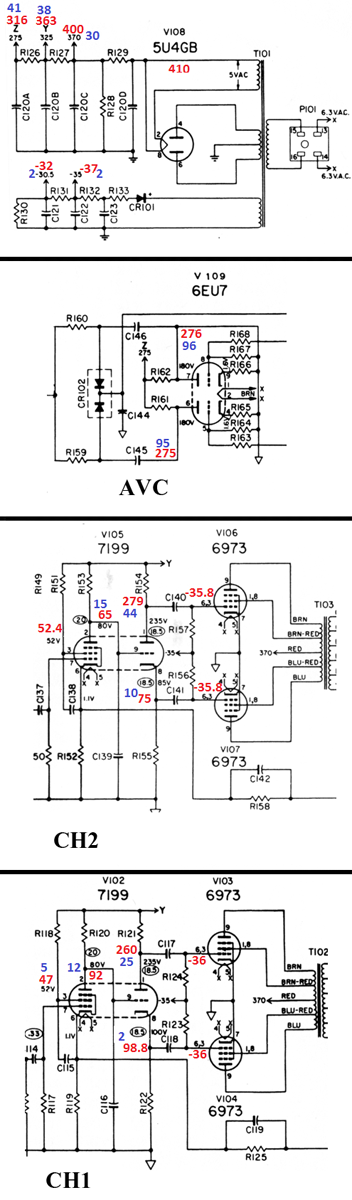 -High measured voltages in these circuits are due to: Weak tubes or cathode resistors that have risen in value. Higher then normal line voltage. Looking at how the deviation increases as you get further away from the primary filter it is clear that current being drawn is declining. I don't consider this related to the noise problem.