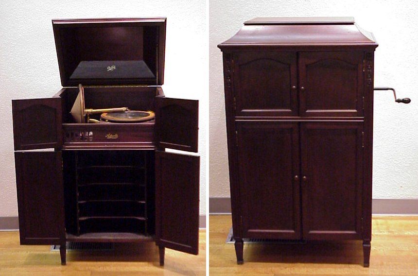 I have a Pathe phonograph similar to this model. It was my great grandfathers and it works perfectly. It even has a supply of little metal needles that haven't been used, along with dozens of phonograph records filling the shelves of the Pathe itself. I crank it up every now and then and think about what it would be like to only have that as a form of entertainment. Very weird and nostalgic.
