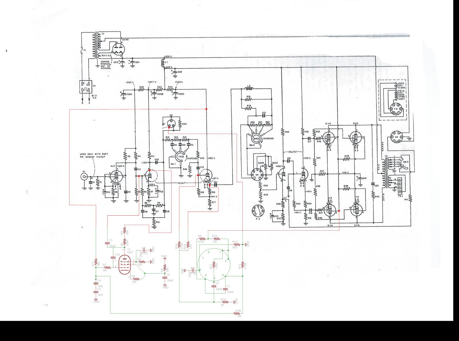 3) I'd skip the AGC switch. Seeburg was "antsy" about introducing a compressor for fear that it would anger the "Hi-Fi" crowd (as if they cared about jukeboxes). There is also a situation where an excessively loud record will overdrive the 6SK7 and cause the Grid-1 to go positive and the tube to lose control of the gain. This results in blasting and distortion. Adding that switch allowed one to lower the drive to that section.