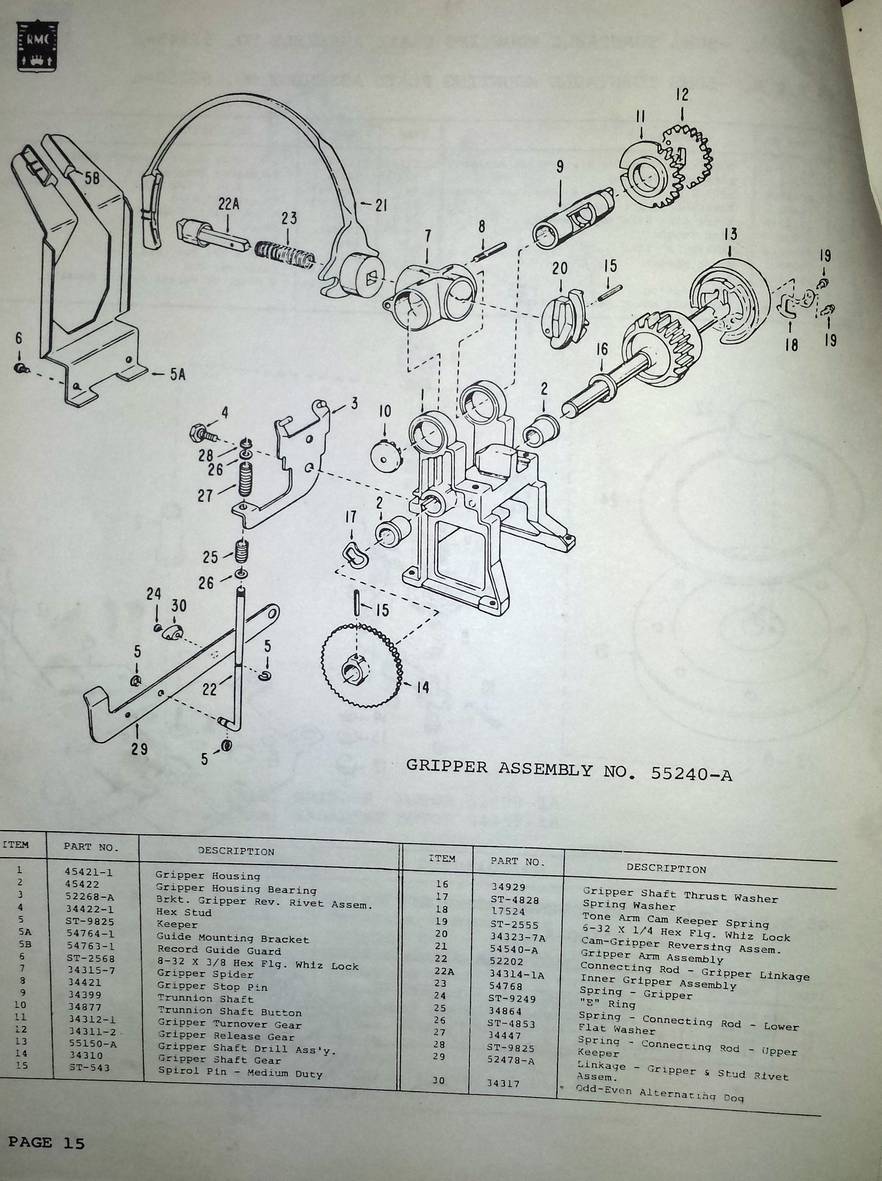Ron Rich wrote:I'z totally confuzzed now--"slop"--don't recall ever seeing this in a RockOla gripper--guessing here--one or more of the "pins" (such as item 8, or 15) is missing--broken off ?? Ron Rich