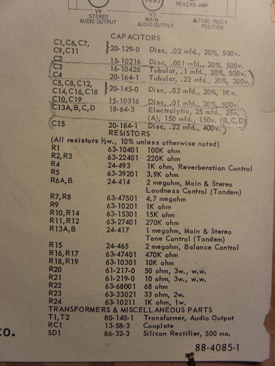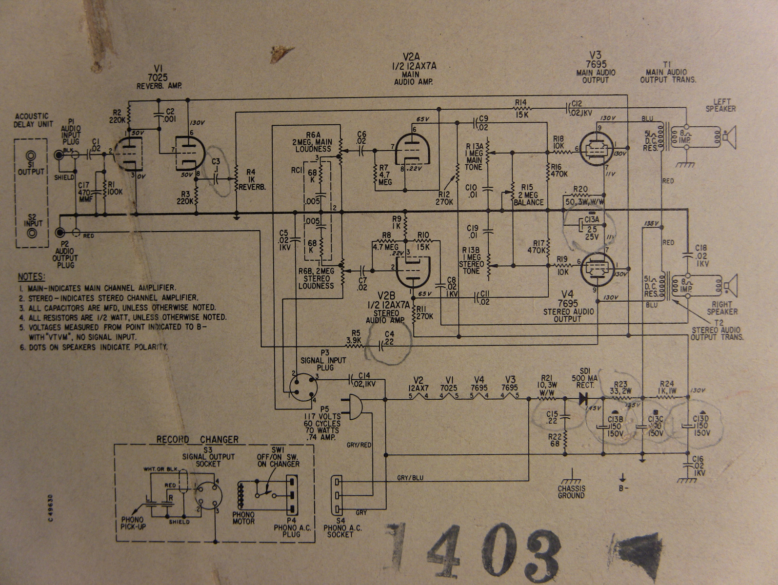 Something I noticed that doesn't jive between the Sams schematic, and the original cabinet schematic is how the negative of each transformer is connected back to circuit. My wiring (in line with the cabinet schematic) show the negative of the left channel going directly to chassis.