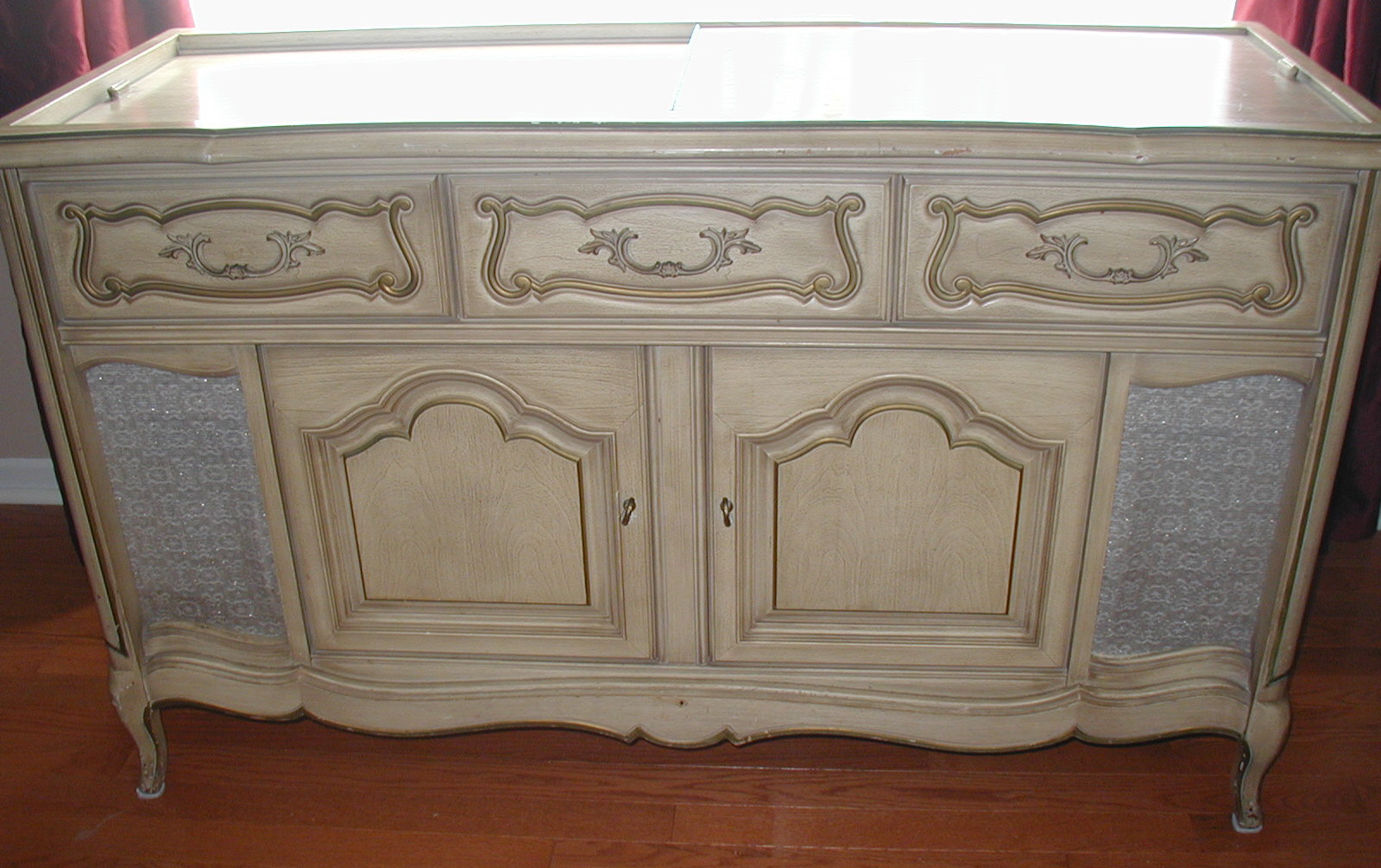 This 1964 Magnavox Normandy (French) Provincial model comes the closest, though it has two mock drawers instead of three.