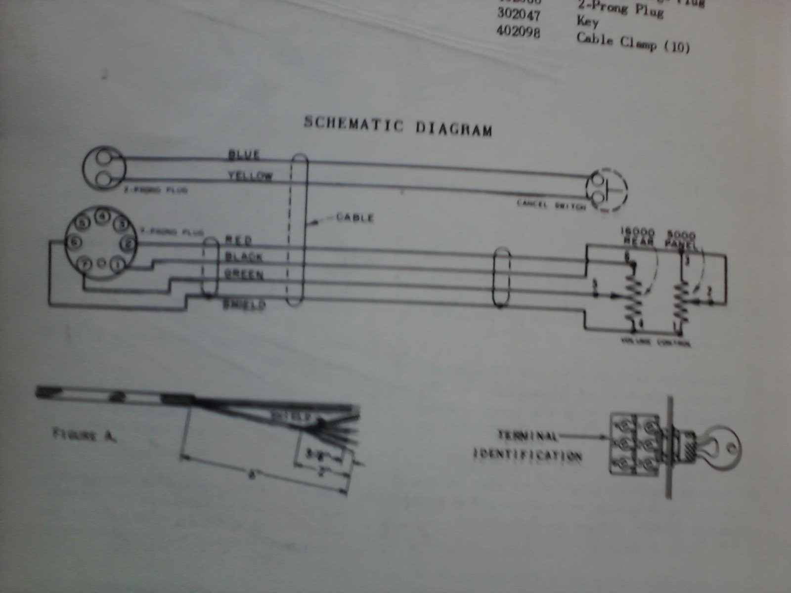 I have found a double gang POT that I have added resistors to so that it is close (5K and 16K) to what the specification is for a M100A Seeburg remote. The problem is that I have no idea if the six contacts are in the same "pattern" as the original. See the attached photo of the page in the manual. The problem is that the contacts are labeled one through six on the POT and the PLUG. I followed the same pattern via the color code, but that may just a guess.