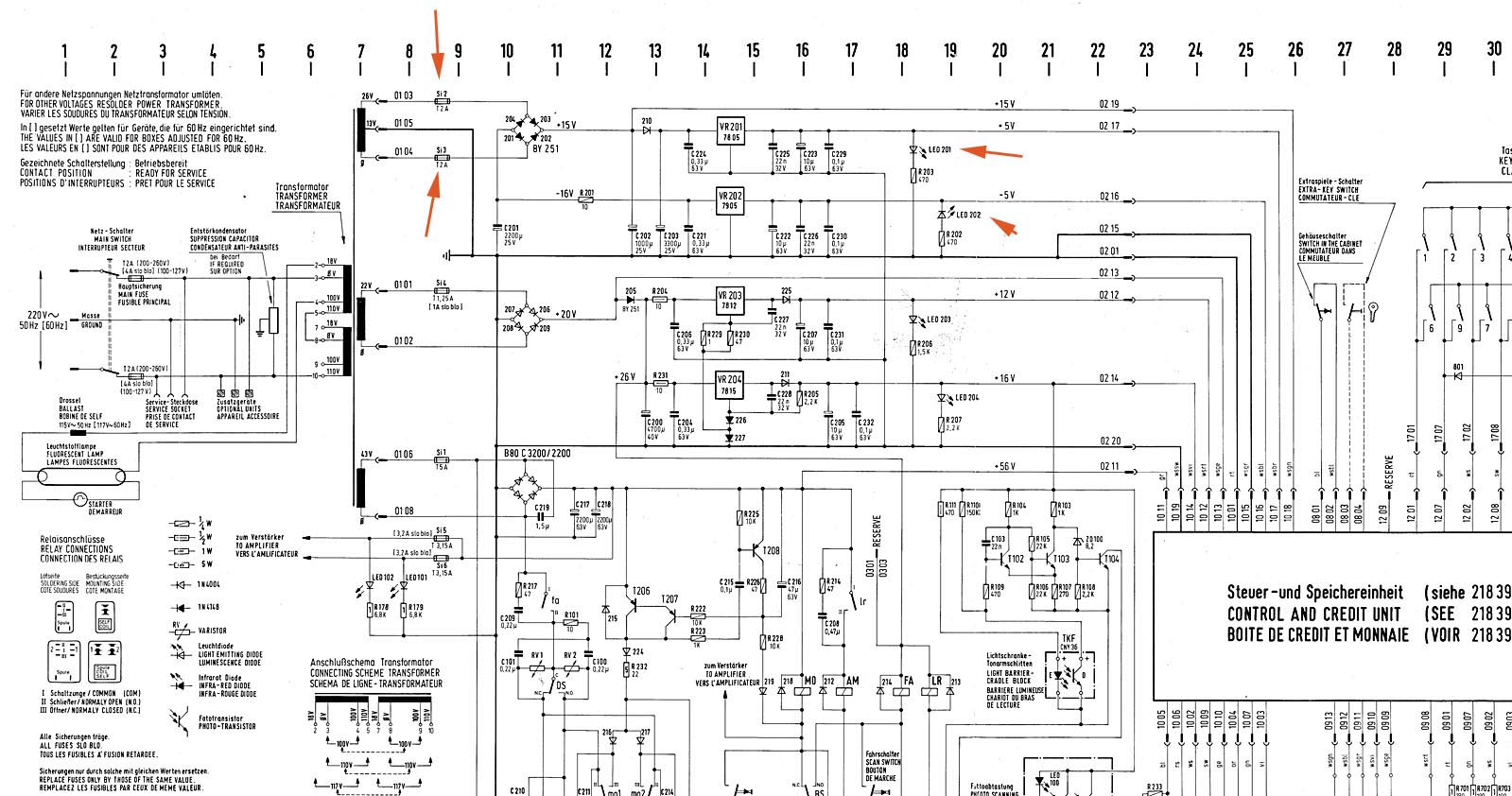 Ok guys so bear with me I am new to the world of jukeboxes but I have an arcade video game and a few old em games so not totally foreign to the world of fix it yourself electronics. I have a newly acquired, non working, NSM Consulette jukebox that plays 45's that I would like to fix up, I thinks its from the early 80s. I picked it up for super cheap when I was buying a different arcade game, It was cheap so I couldn't say no. It has been stored in a basement for the past 15-20 years and the base needs replaced, just easy woodwork. I have a service manual and it says it has ES II technology, what ever that means? So anyway, two fuses on the main board (CENTRE) keep blowing right away when I power up, fuses Si 2 and Si 3. When I replace the fuses the +5 watt and -5 watt led's light up for a second while the two fuses are blowing then they go off. Where do I start? Is there some common problem that I should start with that will cause this? What do these fuses control? I was messing around with the relays and got the carriage to move back and forth, not sure if that info helps? Thanks in advance for any and all help / information